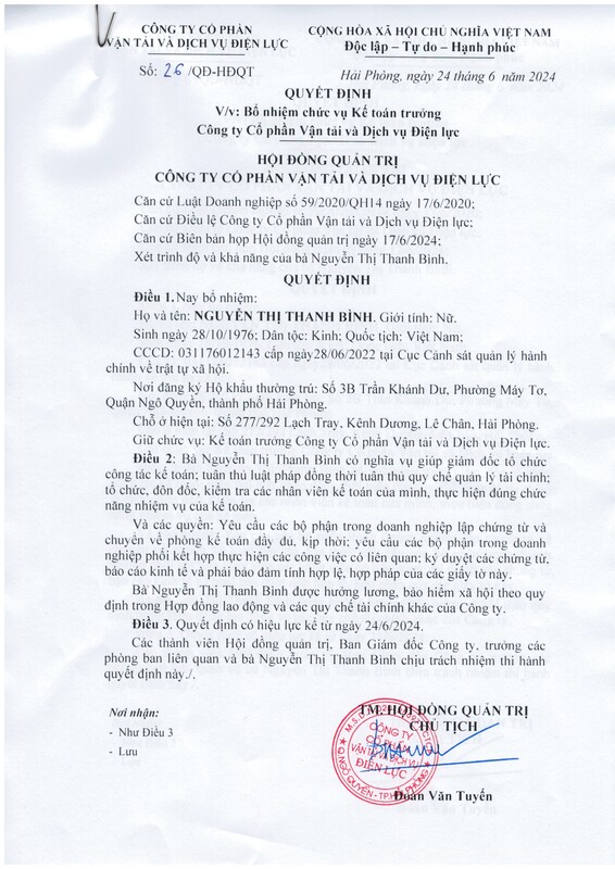 Phòng Tổ chức Thông báo về việc Bổ nhiệm chức vụ Kế toán trưởng đối với bà Nguyễn Thị Thanh Bình từ ngày 24/6/2024